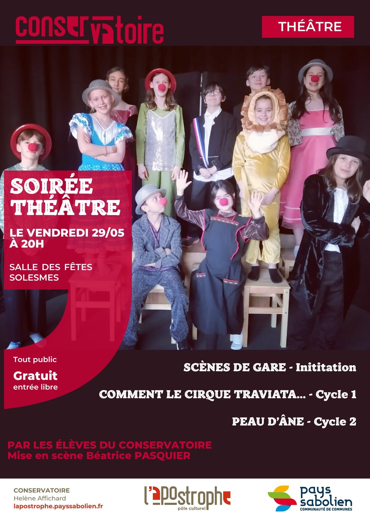 Les élèves du Conservatoire Hélène Affichard du Pays sabolien vous proposent une soirée théâtre en 3 temps : « Scènes de gare » par les élèves d’initiation, « Comment le cirque Traviata. » par les élèves de Cycle 1 et « Peau d’âne » par les élèves de cycle 2.