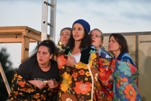 Emportées par les musiques de Vivaldi, des chansons de Lara Fabian ou Leonard Cohen, 5 danseuses vêtues de robes aux couleurs vives et variées font front pour ...dévoiler leurs fragilités, leurs révoltes et leurs identités multiples. Tandis que les tissus volent, brillent, craquent, tournent, traînent ou tombent, les corps fusionnent, vibrent et se soulèvent. Ensemble, elles cherchent à se libérer de leurs carcans dans une énergie folle.
